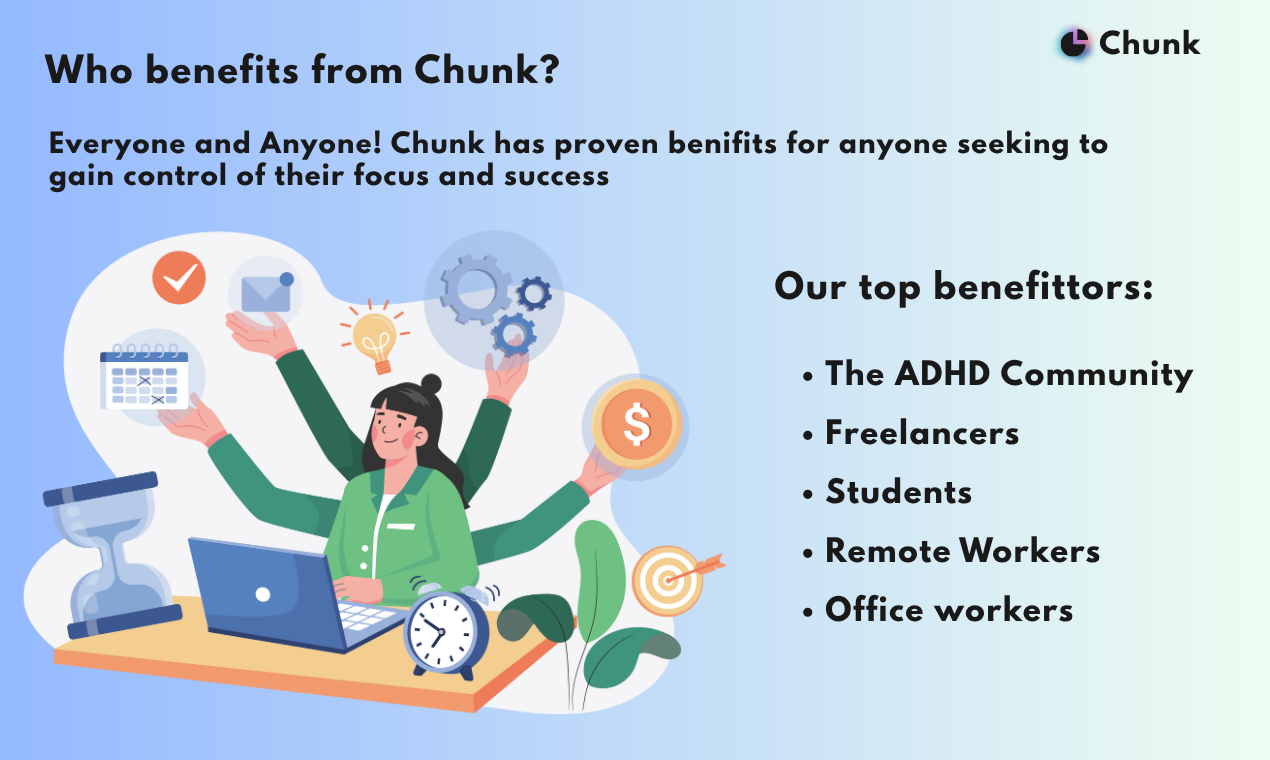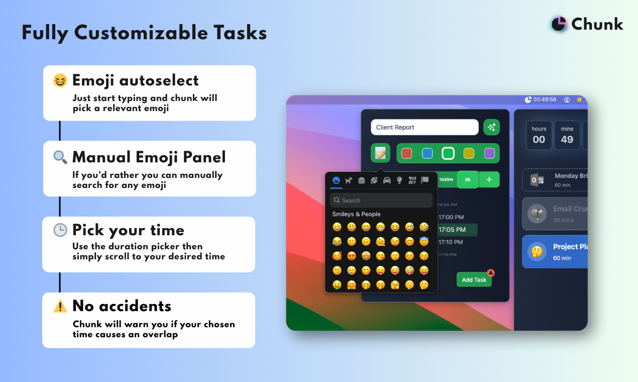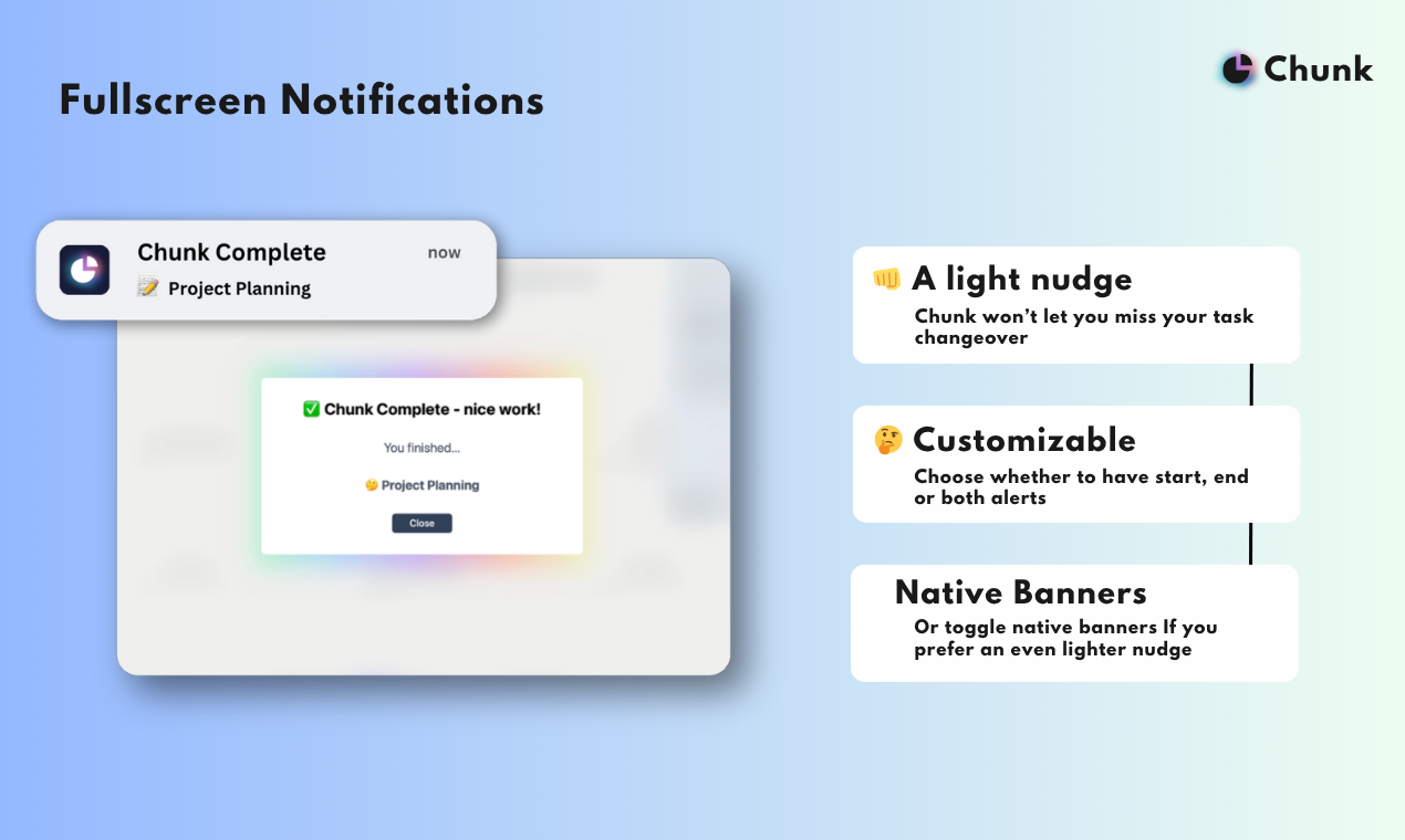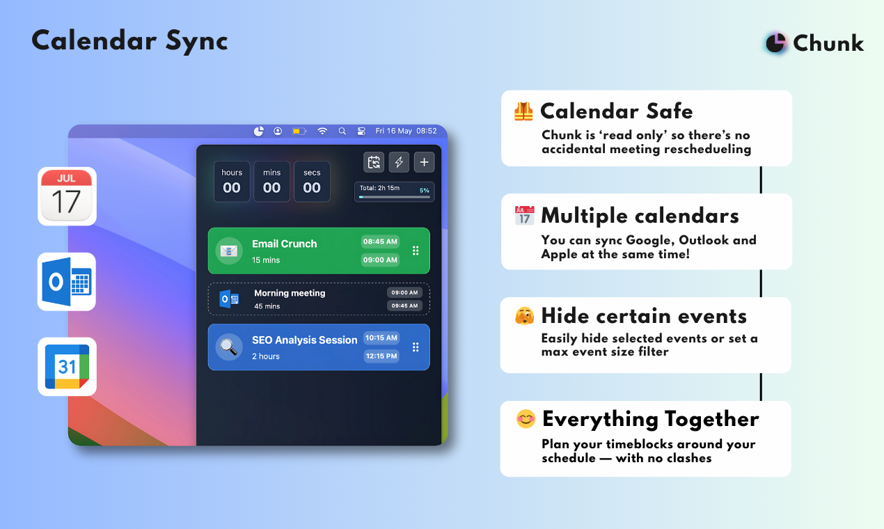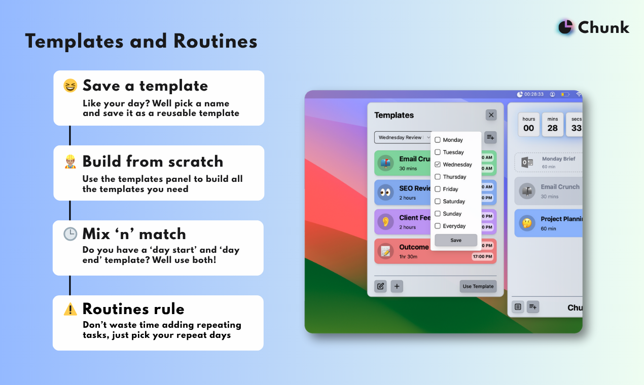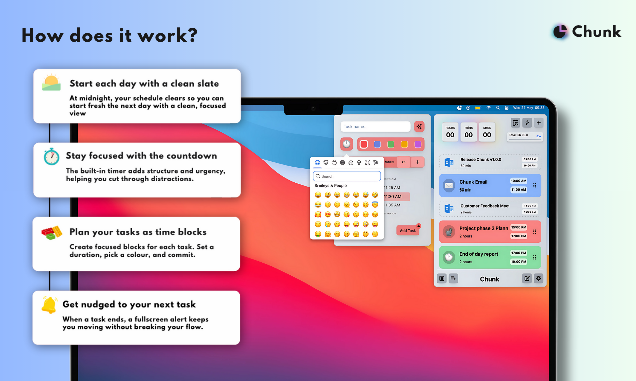「Chunk」は、シンプルで使いやすいタイムブロッキングアプリで、ユーザーがスケジュールを守る手助けをします。macOSのメニューバーに常駐し、クリーンで集中できる一日の視覚を提供します。