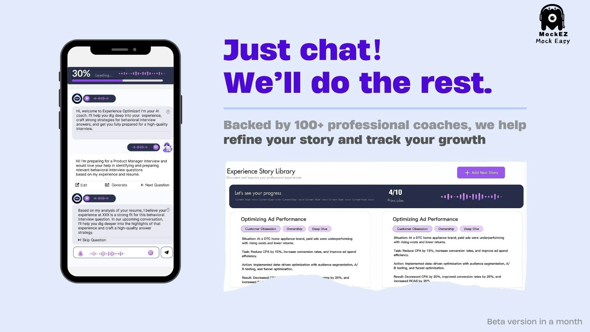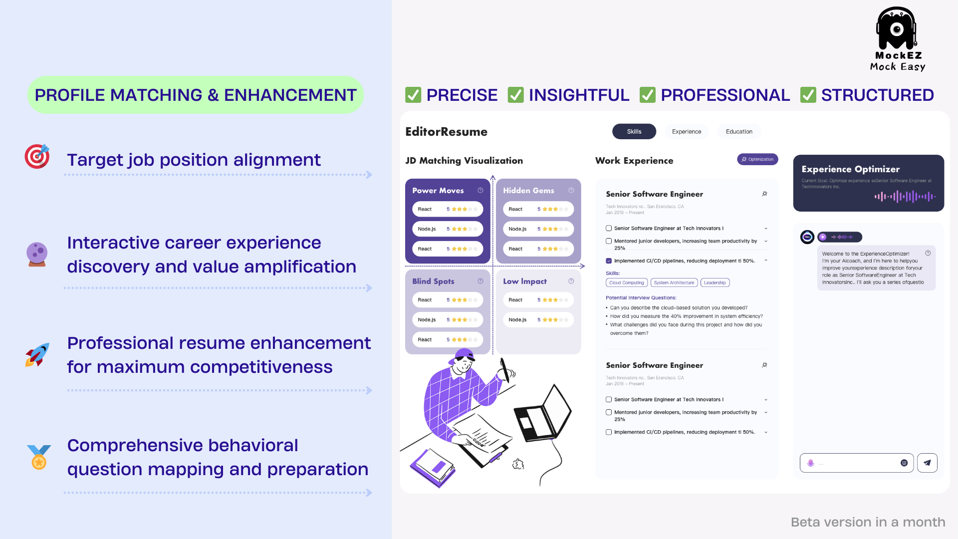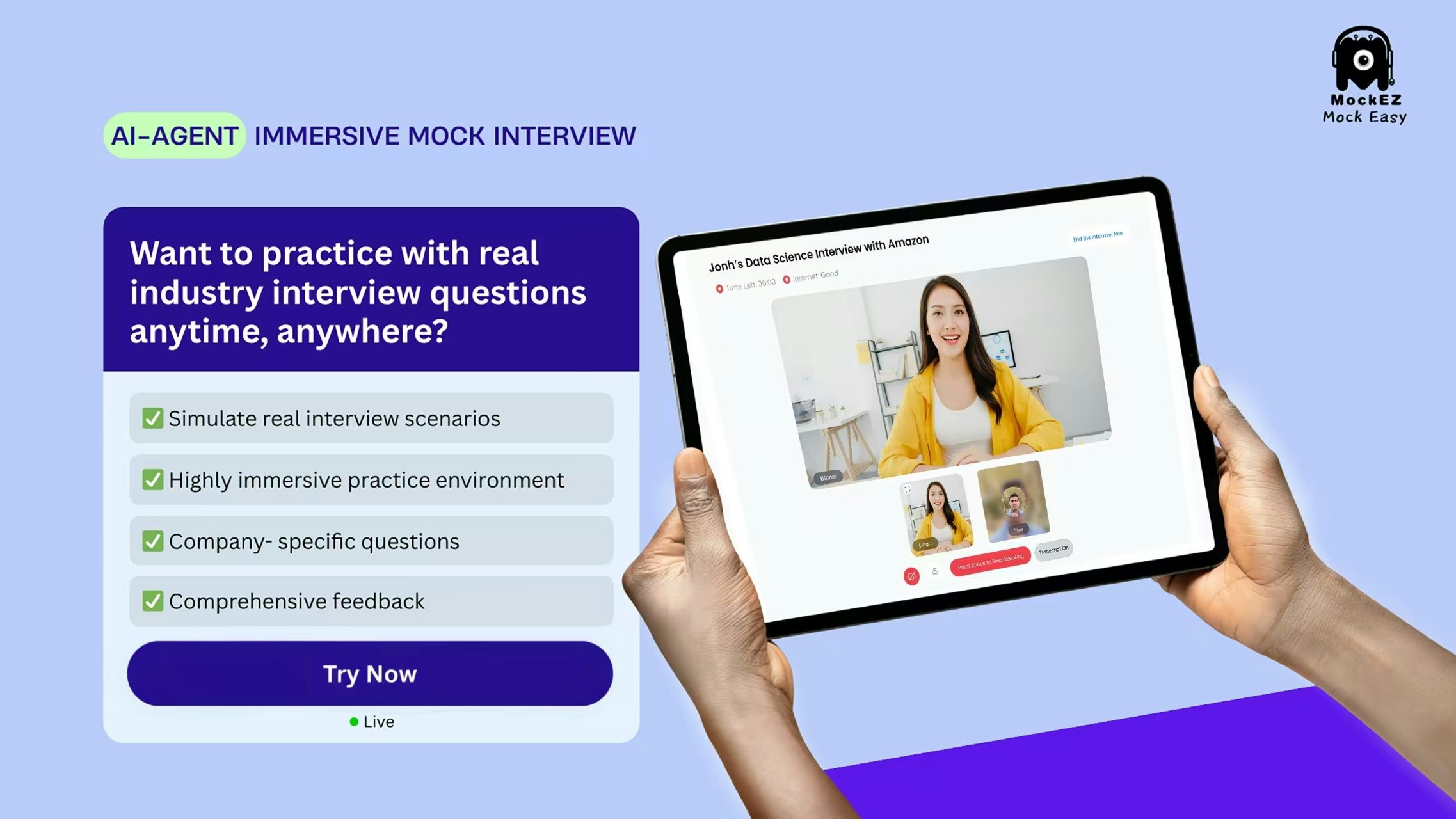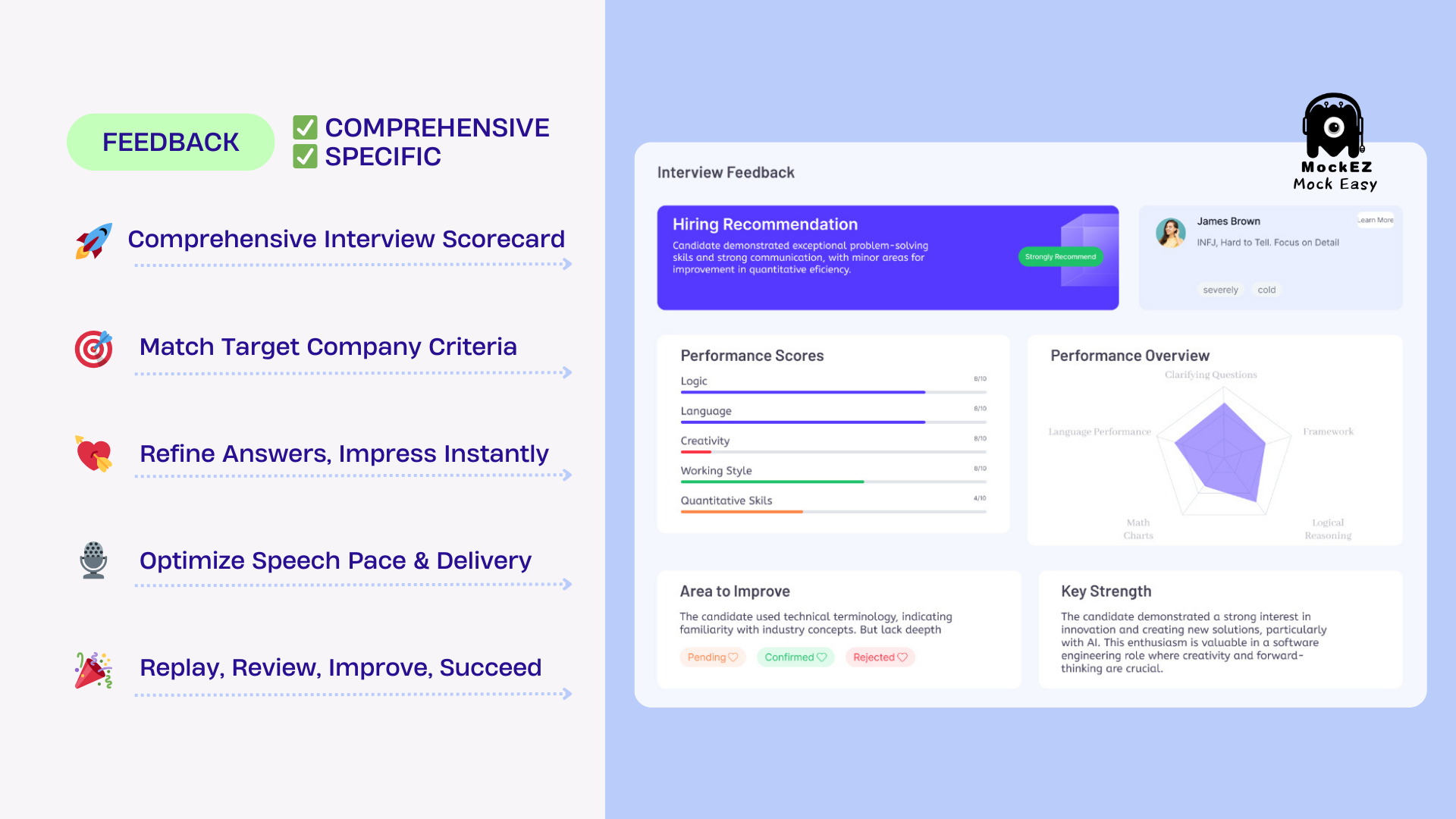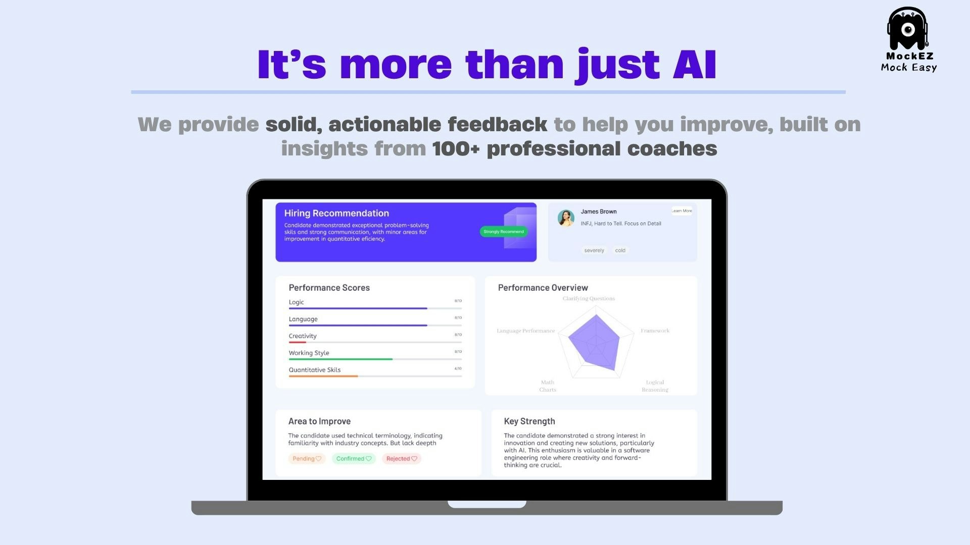 MockEZは、AIと人間の専門知識を組み合わせて、面接準備をよりスマートで個別化されたものにするプロダクトです。ユーザーは、パフォーマンスの分析や強みの強調、具体的なフィードバックを受け取ることができ、実際の業界専門家からの洞察を基にした5000以上の本物の面接質問を活用して準備できます。
