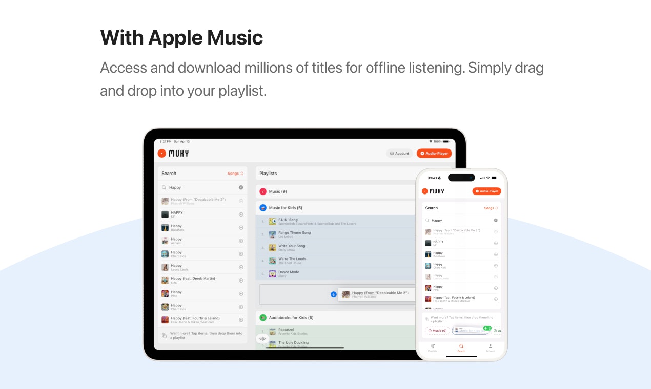 「Muky」は、子供向けの音楽やオーディオブックを安全に楽しむためのアプリで、オフライン再生、親によるコンテンツ管理、ガイデッドアクセス機能が特徴です。これにより、親は不適切なコンテンツや通知による気散じを心配する必要がなくなります。